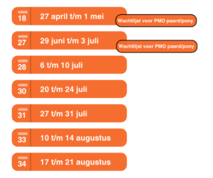 We hebben per Instructieweek en -weekend niet onbeperkt ruimte voor de huur van een PMO paard. We vragen hiervoor je begrip. Mocht het zo zijn dat je je opgeeft voor een week waarin de PMO paarden al verhuurd zijn, nemen we contact met je op om de mogelijkheden te bespreken.