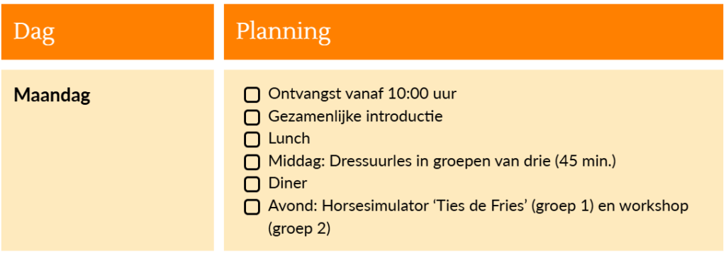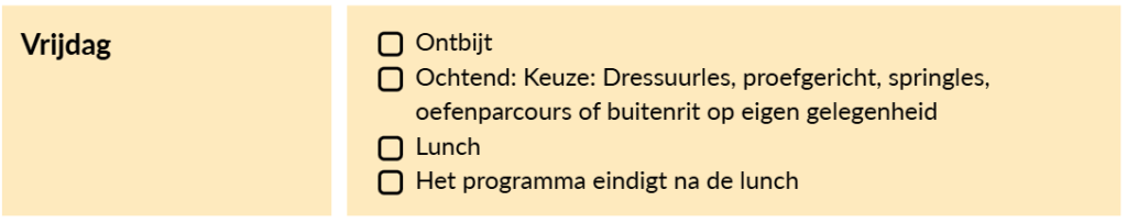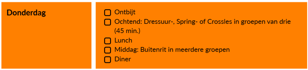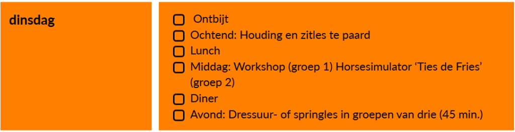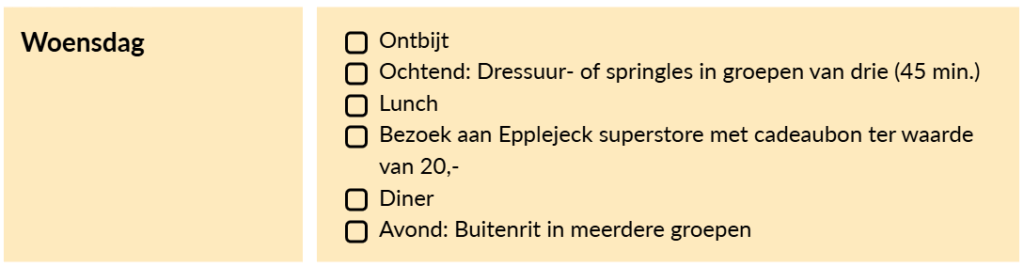 Hieronder vind je de globale indeling van een Paard en Ruiter Instructieweek:
